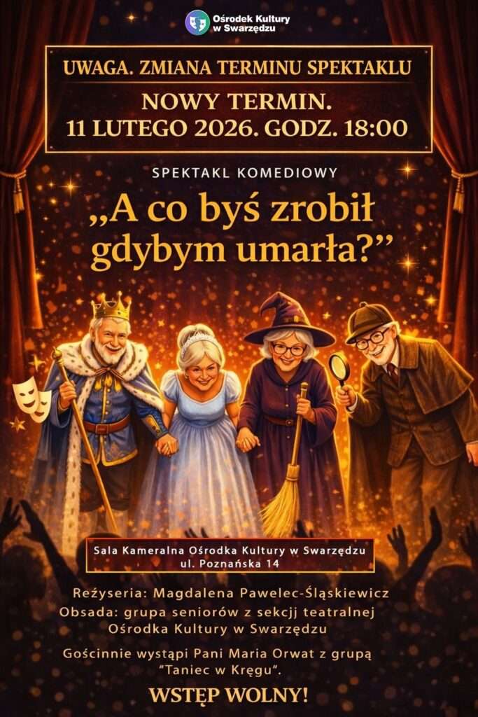 Serdecznie zapraszamy na spektakl komediowy pt. „A co byś zrobił gdybym umarła?”, który odbędzie się 28.01.2026 o godz. 18.00 w Sali Kameralnej Ośrodka Kultury w Swarzędzu. Jest to efekt pracy grupy seniorów, która uczęszcza na zajęcia teatralne prowadzone przez aktorkę Magdalenę Pawelec-Śląskiewicz. Seniorzy pod okiem instruktorki przygotowali spektakl złożony z refleksyjnej filozoficznej prozy, wiersza oraz komediowych scen teatralnych.