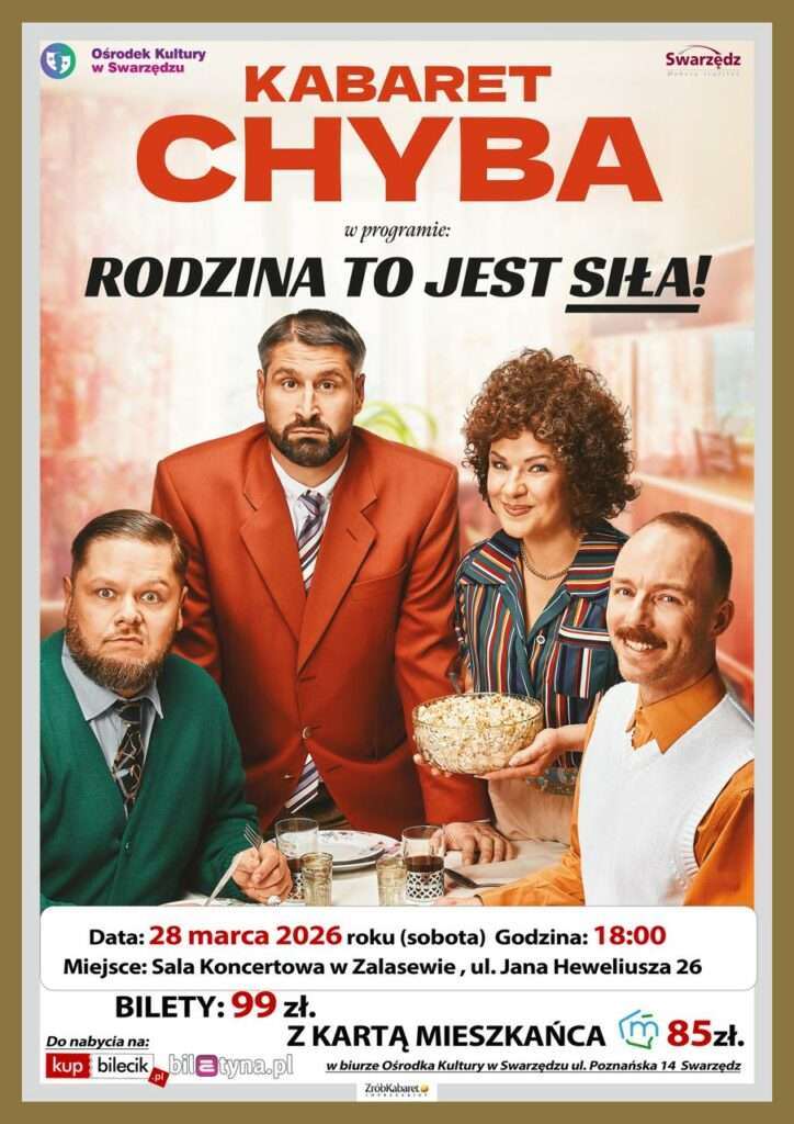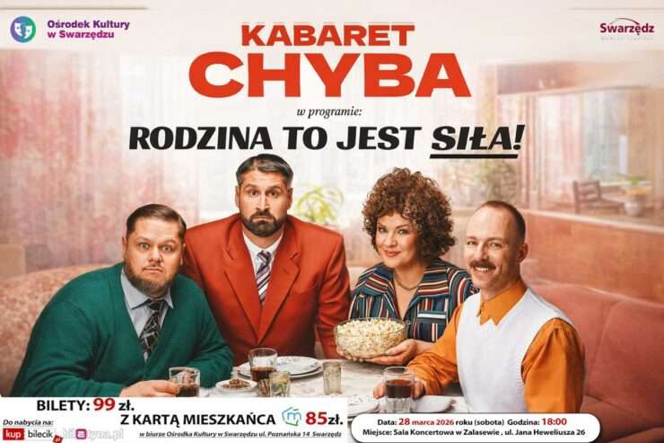 “Rodzina to jest siła! “ śpiewała kiedyś Kayah i artyści z Kabaretu Chyba wzięli to sobie do serca – tak brzmi tytuł ich najnowszego programu! Po sukcesie spektaklu “Cztery” Chyby ruszają w Polskę z absolutnie nowymi skeczami i piosenkami. A z czego będziemy się śmiać? Z tego co dla każdego Polaka jest najważniejsze! Rodzina, ach rodzina… Czasem wkurza, czasem śmieszy, ale jest!