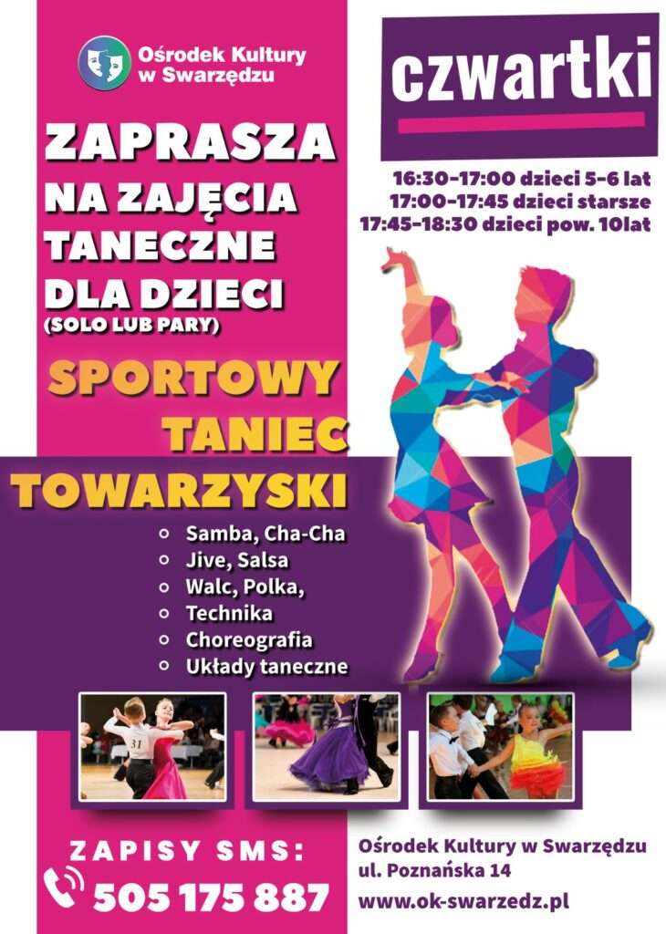 Ośrodek Kultury zaprasza wszystkie dzieci na piątkowe zajęcia taneczne (solo lub pary). W programie: sportowy taniec towarzyski – Samba, Cha-Cha, Jive, Salsa, Walc, Polka.